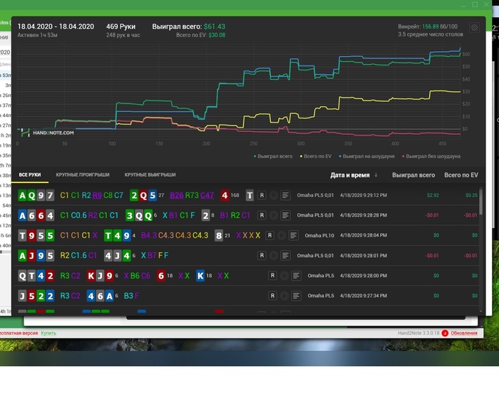 Всем снова привет. Продолжаю свой легкий обзор на попытку преодолеть лимит PLO 10, ну и конечно же себя дисциплинировать. Играю лимиты выше всегда, но сейчас плотно работаю над игрой) Очередная сессия. Незабываем - главное результат))) Всем ГЛ