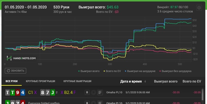 Всем привет. Начало месяца нового - новый марфон и новые цели! Понеслись вперед. Стартанул новый месяц с игры в другое время суток, решил попробовать увеличить время игры. Как сказал Lorem: пока карантин нужно пользоваться этим полем. Так что играть буду две сессии в день теперь Начало этой игры было нормальным. Контролировал мысли и раздачи. Потом за двумя столами зацепился с игроками и много проблефовал - недоезжали мои ожидания. Позже взял себя в руки и потихоньку начал играть в свою А игру, но и конечно не обошлось без моих переездов для оппов... пару раз психанул и ловим свои ауты, поэтому EV так и показывает.