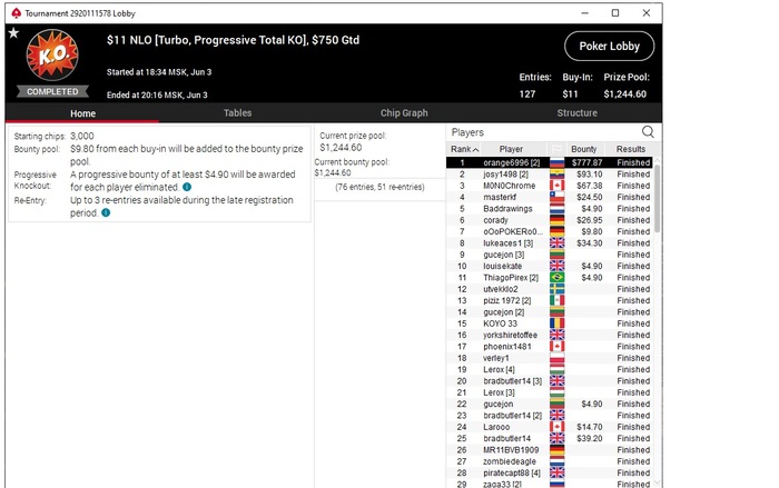 В последние две недели жесточайше заливал, в итоге дошел до -2,5К и совсем не было настроения писать. В итоге убрал из загрузки турики по 27, не то учитывая мою страсть к реентри до победного, существует риск проснуться без банкролла в коробке под мостом Но в последние 3 дня наконец то автомат начал отдавать и полторашку вернули обратно, 2 раза получилось затащить тотал нокаут омаху по 11, причем последний вообще эпичный, я даже не думал, что в турике на 130 человек можно сделать столько нокаутов