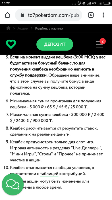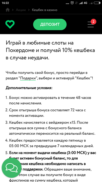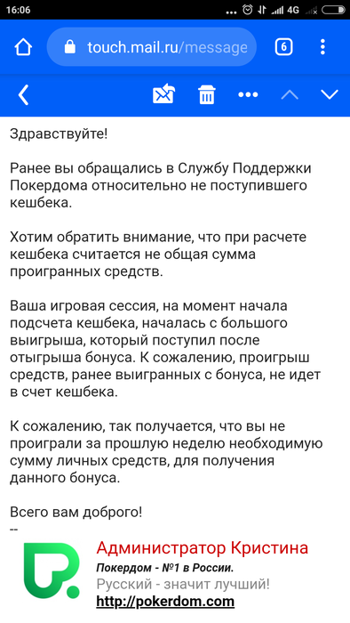 Всем доброго времени суток. Вопрос заключается в следующем. У ПокерДома для раздела казино есть такой бонус как кешбек, условия бонуса приведены ниже Данный бонус был успешно отыгран на прошлой недели и деньги были зачислены на основной баланс. После часть денег была проиграна, следовательно на этой недели я опять рассчитывал получить данный бонус... Но вот незадача, служба поддержки ПокерДома, данные средства не считает МОИМ ЛИЧНЫМ, хотя в условиях акции нигде не написано, что для начисления бонуса, нужно проигрывать обязательно депозит... Прошу вас рассудить, кто из нас не прав