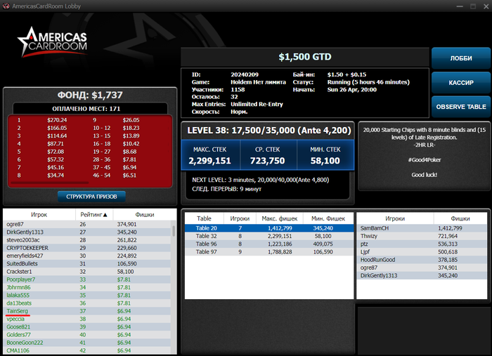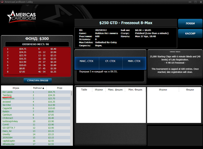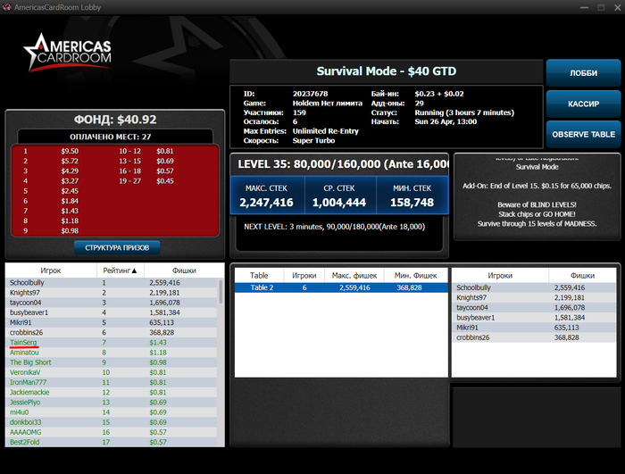 Денег лишних в такой ситуации нет. Вспомнил про старый рум, где у меня было около 3$ и за неделю оформил несколько финалок (одну выиграл) и множество дипранов. Итого БР вырос до 70$. Ах да, рум AmericasCardroom с множеством игроков из Америки. Очень нравится, что нет килополей и глубокие стеки во многих турнирах, в отличие от тех же ПС, где я до этого играл 90%
