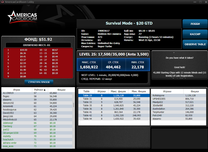AmericasCardroom снова приостановили турнир без предупреждения. Один раз они отменили все турниры ночью, но правда деньги вернули в перерасчёт на места. И какой раз хочу перестроить режим под ночные турниры, потому что у них нет нормальных дневных и вечерних турниров. Сейчас вижу, что там куча турниров запускается с 7 утра. Хм, интересная заметка, что они уже так делали, а потом всё отменяли. Не очень понимаю их. Но играть ночью хуже, самочувствие ужасное (может с непривычки). Но мало вижу сияющих людей, которые живут ночной жизнью. Всё-таки ночь на то и тёмная, чтобы ничего нельзя было сделать и ты спал (ИМХО)