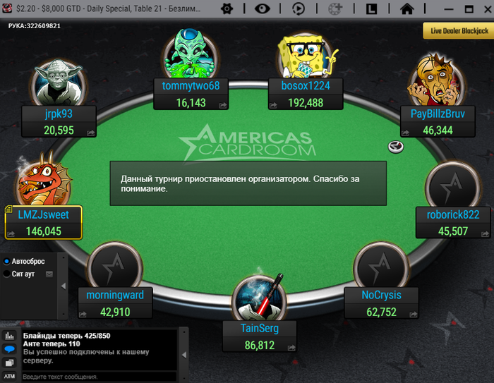 Поступил как дурак, вылетел с дип рановских турниров и закрыл 3 турнира на общий БИ 3$, так как их "Данный турнир приостановлен организатором" может продлиться фиг знает до какого времени. Лучше встану в 7 и пойду катать снова (если они их снова не отменят)