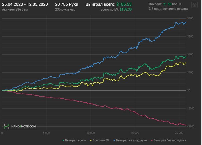 Ну винрейт неплохой. Вывожу 150 долларов. Остается 150. Не унываем, руки не опускаем. Очень вовремя бросил курить и начал заниматься утренним уличным спортом, депрессия не грозит, пока имеется интерес к игре. Поставлена цель играть пл10 в июне. Попробую добавить 1-2 стола Покеркинга и может даже Покердома. БР: 150$