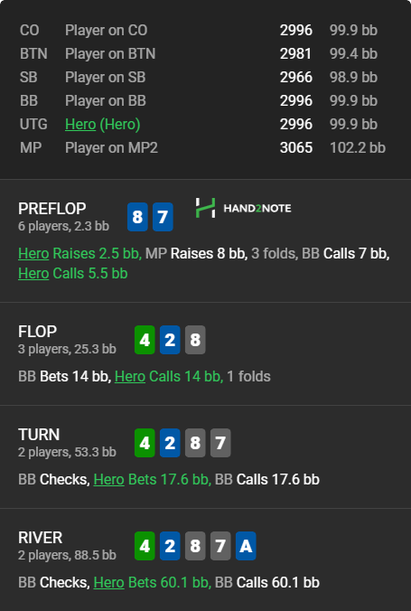 Турн - остаемся вдвоем, теперь доска стала гораздо более скоординированной и ББ чекает. то есть вэлью у него там нет никакого(за исключением слоуплей 65). Может рука типа 76, 75 которая теперь стала средним ШДВ. может A3, A5.