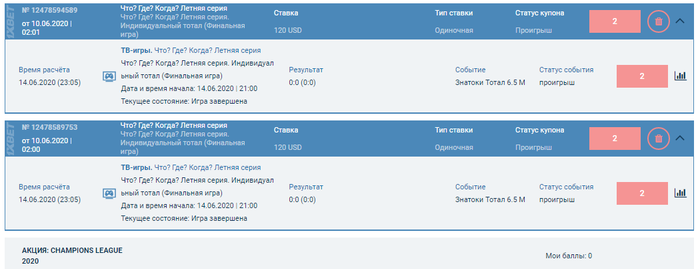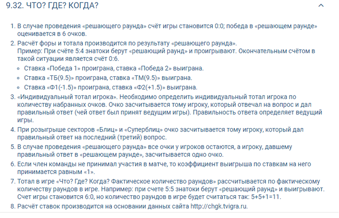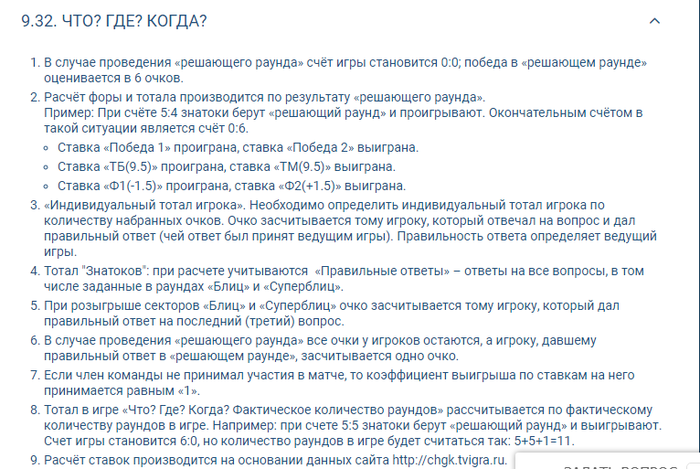 Добрый день,форумчане!Хочу создать эту тему для того,чтобы спросить вашего совета,поделиться опытом и предостеречь от игры в помойке под названием 1хбет. За прошлую неделю я примерно равными долями расставил 5 ставок общей суммой в 11200 грн.(примерно 420 долларов)и 240 долларов на исход игры "ЧТО?ГДЕ?КОГДА?",а именно тотал меньше 6.5 команда знатоков.Это немалая сумма для меня,но учитывая,что игра идет до 6 очков и тб6.5 не может быть априори,я пошел на этот шаг.Предварительно я несколько раз перечитал правила бк относительно непосредственно телеигры и никаких подводных камней не обнаружил. Игра завершилась со счетом 4-6 и я получил расчет с ...проигранными исходами..Как же так?Я связался с саппортом(хотя если честно-считаю их слабоумными гражданами,которые отвечают шаблонными фразами и уклоняются от прямых ответов.Кто сталкивался-подтвердит),они меня перенаправили звонить напрямую в офис и писать письма.Те в свою очередь сослались на пункт правил 9.32.4.При этом пояснив,что под тоталом они подразумевают количество не набранных очков,а общее количество данных знатоками правильных ответов с учетом раундов "блиц" и "супер-блиц",коих по моим подсчетам насобиралось 7.Мне это примерно представилось,как футбольный матч,который закончился со счетом 0-0,но расчитали тб,так как на тренировку забили 3 мяча. В общем я прилагаю все скрины и прошу Вас рассудить эту ситуацию.Как вы ститаете?Проголосуйте пожалуйста плюсом,если вы считает,что прав я и минусом-если контора.Может кто-то сталкивался с подобной ситуацией и есть ли шанс ее решить с свою пользу? Желаю всем хорошего дня и НЕ связывайтесь с помойкой под названием 1хбет!!!