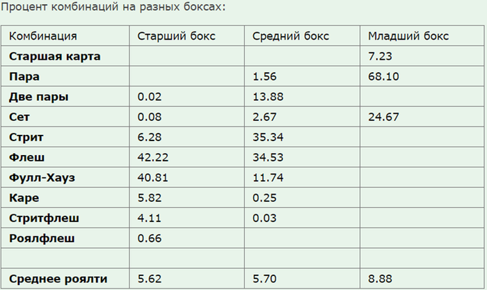 Далее решил посчитать не просто 10кк фантазий для всех вариантов, а еще и посчитать их по старшей карте, т.е. получить на каждой линии все комбы по старшей карте.