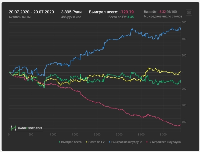 Не могу точно сказать в чём проблема. Я плохо играю или мне не складывается. Или всё вместе. По ощущениям и по отчёту х2н очень сильно не складывается, но оценить свою игру адекватно я пока-что не могу. Приятелей готовых мне помочь -- нет. В покере я совершенно одинок, - был и остаюсь.