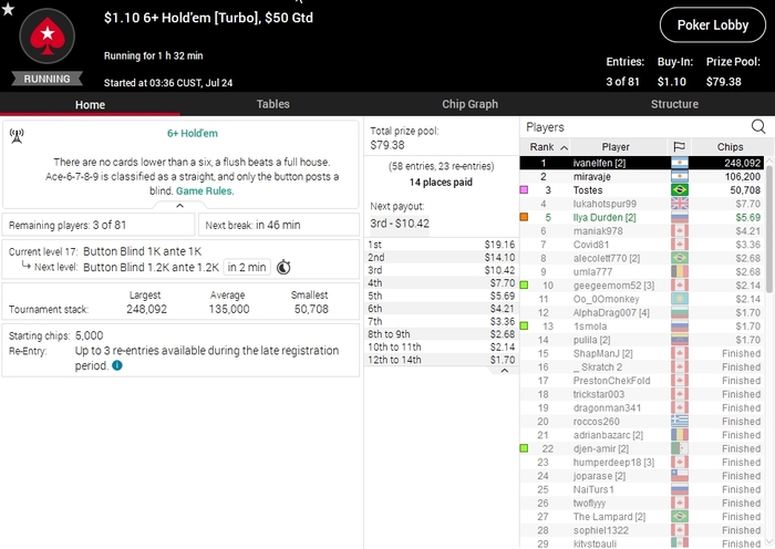 Наслышался о 6+ холдем, решил попробовать поддержать БР. Фишей там действительно очень много и плюсовать на нл2 справится любой. Но это сильно отвлекает от основной игры и я еще умудрился залить два баина, но потом отбил в 6+ турнире заняв 5 место. Хорошо, что прежде я поиграл в кэш и сформировал довольно плюсовую стратегию(на мой субъективный взгляд). Буду время от времени постигать 6+ и ждать турниры в этом формате. Мне очень понравилось.