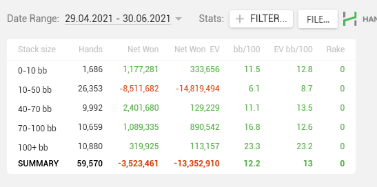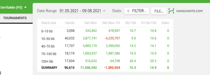 В пятисотках набилась дистанция в районе 150 турниров в слабый плюс, были хорошие дипраны, но не сложилось. В 1к + очень маленькая дистанция.