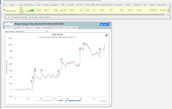 Мои результаты МТТ до $215 включительно с 2019 года. Самый крупный занос был победой в воскресном билдере 215 (150 би).