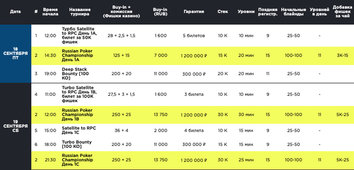 Например: турнир #1, 18 сентября в 12:00. Это сателлит на турнир Russian Poker Championship с