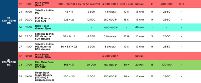 *Разумеется, всех участников грядущей серии ждут и живые сателлиты. В расписание включены сателлиты, в которых вы получаете билет на целевой турнир, набив определенное количество фишек. При этом, если у вас еще остается стек, то вы можете продолжить игру, и постараться набить еще один вход! Такие сателлиты помечены в расписании как [Выиграй билет за ХХХ фишек]