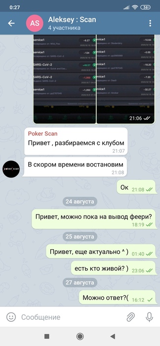 Здравствуйте! Играю через аффилейта https://scan.poker. История началась 18 августа, сняли все фишки с аккаунтов (платформа PPPoker, клуб FairyTale). Уже 24 августа поддержка перестала отвечать на сообщения вообще, последнее даже не прочитали. Владелец сайта oracle_ofc на связь так-же не выходит.