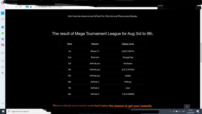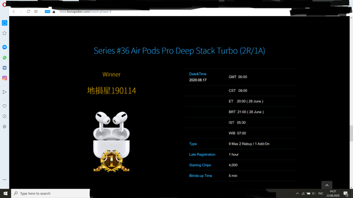 Добрый день!Меня зовут Алексей , я из России. Столкнулся с очень неприятной ситуацией в руме Bona Poker . Дело в том ,что рум ,видимо , совсем новый, но он не выполняет свои обещания по выплатам в качестве призов. В этом руме есть игроки разных национальностей ,в том числе из стран СНГ ,Украины и России . Месяц назад ,с 3 -9 августа проходила гонка в турнирах,по которой было необходимо получить максимальное количество очков по ИТМ . Под конец недели я вырвался вперёд и взял 1 место Гонка есть у них на офф. сайте удалено Также в руме масса фрироллов c призами,которые нельзя обменивать на деньги ,они считаются внутриигровой валютой ,которую можно использовать на ребаи и аддоны. Каждый день проходить турнир с гарантированным призом ,с одним призовым местом.В одном из таких турниров,полторы недели спустя я взял 1 место и это AirPods Pro Бессонные ночи игры, постоянный стресс подтолкнули написать меня этот пост. Саппорт ни в какую не хочет отправлять выйгранные мной призы,ссылаясь на то, то "у Aplle проблемы с доставкой из за Covid-19 " " у нас ошибка при ордере , пришлём Вам скрин почтой " Они предлагают выбор : наличные деньги на PayPal с комиссией 20 процентов ( себе ) или отправка товара.Разумеется,я хочу увидеть свой айфон и наушники , потому что ордер примерно на 1000$ и 200 $ мне не хочется выкидывать впустую Саппорт ведёт себя очень некорректно , язвит и позволяет себе шутки в том плане,что "если вы считаете ,что мы скам- то мы будем считать себя скам проектом Эта история длится уже месяц и я в отчаянии . Хочется привлечь внимание общества и решить эту проблему. Как же всё сложно в этих "китайских румах" p.s разумется, со стороны компании apple.com я не верю в какие-либо проблемы с доставкой в Россию. Ниже прилагаю все скриншоты переписок и достоверность того,что призы выйграны мной и никем иным. Спасибо!