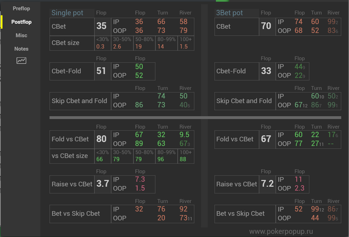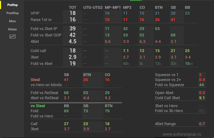 увидел бы тебя за столом, эксплоитил бы очень жестко тебя, судя по статам. к примеру, как цбет в сингл поте у тебя может быть 35% в позиции, а в мультивей поте 68% вне позиции? Ну или фолд на цбет 67% в позиции, Карл, в позиции! Стил маленький. Много падаешь на стил и на рестил. 3 бет... еще очень и очень много всего. Ты чересчур тайтовый и явный фит ор фолдер, вот тебя и выдавливают постоянно с банка и ничего ты не зарабатываешь. играю, кстати, в покер второй месяц :)) И как посоветовали выше, играй рег столы, а не зум. можешь черкануть мне в лс, скину материал по которому я учился :))