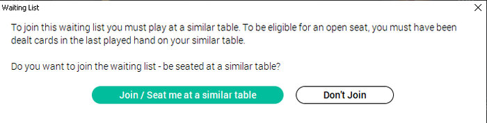 Покер-рум "не разрешает" мне встать в очередь за стол 1, пока я не займу место на каком-то другом столе (столе 2, предполагаю, что не полном). Если я выхожу из-за стола 2, меня выбрасывает из очереди из-за стола 1. Если я отказываюсь сесть за стол 2, меня не сажают в очередь за стол 1. Это такое нововведение у них? Чтобы люди не могли адекватно проводить селект столов? Типа и так 4 регулярных стола одновременно можно играть, так теперь ещё и без селекта?