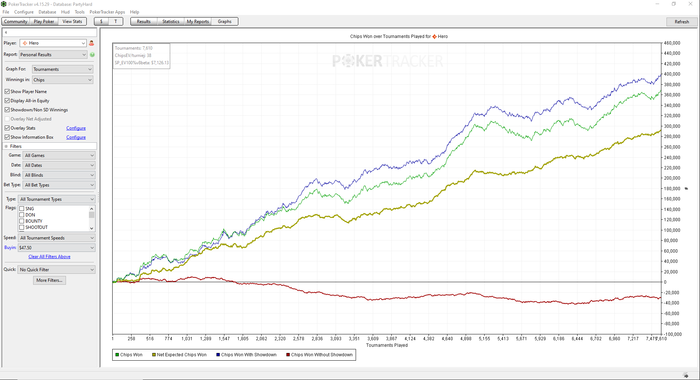 Играю (это важно, по-моему, для тренера, т.к. только играя, можно находиться в тренде и разбираться в тенденциях) на PartyPoker 50-100й лимиты. Результаты такие: