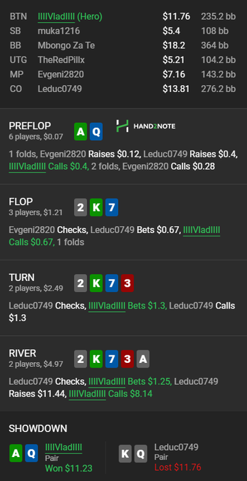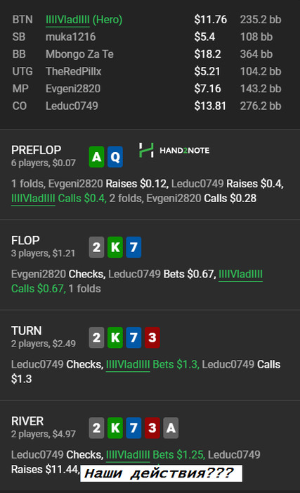 Потом идёт какой-то "туда-сюда ещё" блеф, но необязательный, фэ немного, из-за крупного, как для 3бет-потов, его сайза контбета в бутерброде в двоих по флопу - там намного больше велью, то бишь Кх+, чем в кбете 1/3, так что скорее, минусовый блеф, ИМХО.