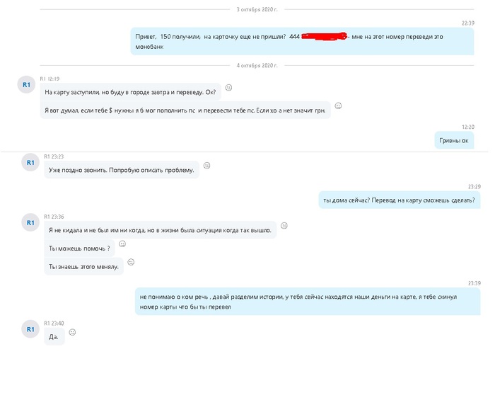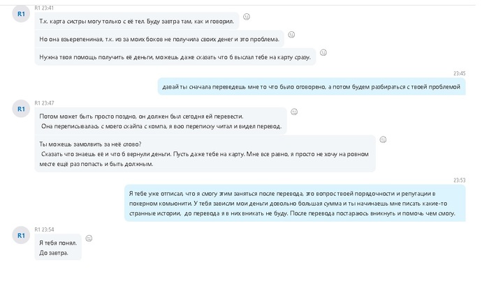 Играл у нас в фонде, поднимался с начальных лимитов, пару пакетов закрыл в плюс, ушел в минус 1688 дол., потом профитнул 2К+ на 888, договорились, что он выведет себе на карту и переведет фонду. Но перевода не произошло, вместо этого Александр написал, что его кинул меняла тема выше и сказал, что бы я , забирал деньги фонда у менялы. Я отказался в этом участвовать, тк ситуация с обменом была его частной инициативой и с фондом не согласовывалась. Попросил дать ему пару дней для перевода, тк деньги у него на аккаунте 888 были и ему их нужно было отиграть, но после пропал на связь не выходит.