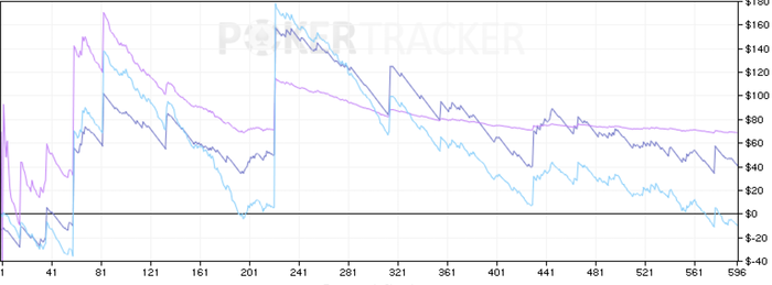 Как видно на графике – сейчас у меня даунстрик, который оказывал сильное моральное давление. После вчерашнего отдыха чувствую себя отлично. Думаю. отчасти стрик вызван слишком тайтовой игрой и страхом потерять банкрол. Когда стал вскрываться шире, обнаружил, что очень часть оппоненты играют с мусором. Сегодня играл оптимально. Понял, что нужно принимать более рискованные дисперсные решения. Это приносит свои плоды. Меньше призовых, но те призовые что есть – финальные столы. Учусь легче относиться к переездам и вылетам из туриков.