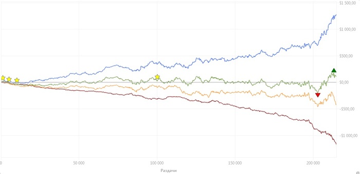 За всё время на всех лимитах играю -2бб/100, рейк составляет 7бб/100. На данный момент игра около нулевая с учётом того, что играть на Лидерборд приходится много, порядка 10ч, концентрация конечно теряется, как и падает качество принимаемых решений. Большинство из Вас знает, что на ГГ игра идёт без статистики, соответственно решения принимаются более дисперсионные, отсюда фактически рейка уплачивается больше.