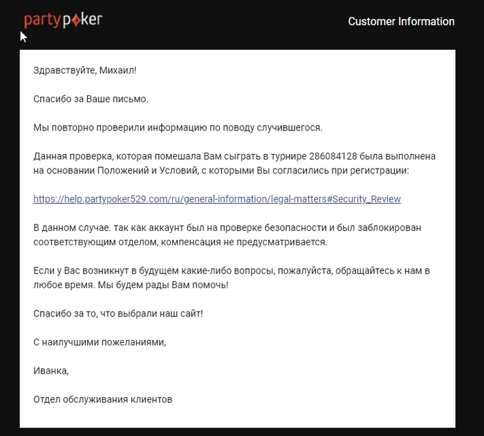 То ли у меня отношения с пати не сложилось, но что то пошло не так. Играю я почти на всех румах, все везде верифициравоно, отбирался в оффлайн. Нигде нет никаких проблем кроме пати. Один раз они меня заблочили без объяснения причин. Ну да бог с ними там на счету денег не было. После ребрендинга или как это назвать не знаю(когда все меняли ники) они мне разрешили создать новую учетную запись. Два месяца верификации и доказательств что я не верблюд вроде все ок, депозитим заливаем. Все как обычно. но вот как то сложилось что под акции на WPT решил посерьезнее отнестись к игре на пати, задепозитил, раскрутил бр, катаю доволен софтом полем игрой турнирной сеткой. Неделю назад на работе решил пойти покурить... А телефон значится с собой не беру(чтоб не разбить).Смотрю пришло сообщение пароль успешно изменен... Ну как полагается трубить в тп пати начал, все ок быстро заблокировали аккаунт. О чудо думаю я, сменю пароль, и все ок... не тут то было, написал заявление, потом опять начал доказывать что я не верблюд. И все бы ничего, можно было бы потерпеть. Но через 5 дней у меня должен быть финальный день сателита на ириш опен за 1100 евро. я начал бить тревогу что мол время поджимает, я не могу зайти в рум. Отобрался на финальный степ с сатов по 1.1евро, катая их каждый день пачками, стек на финальном степе был 1.4м+, что эквивалентно 144евро. Т.п. сказало не переживайте все ок. Как итог они меня разблокировали через 12 часов после этого сателита который я не смог сыграть по их причинам. Компенсации сказали вам не полагается, это была их прихоть проверить аккаунт дополнительно, и покер на мои деньги время и труд.