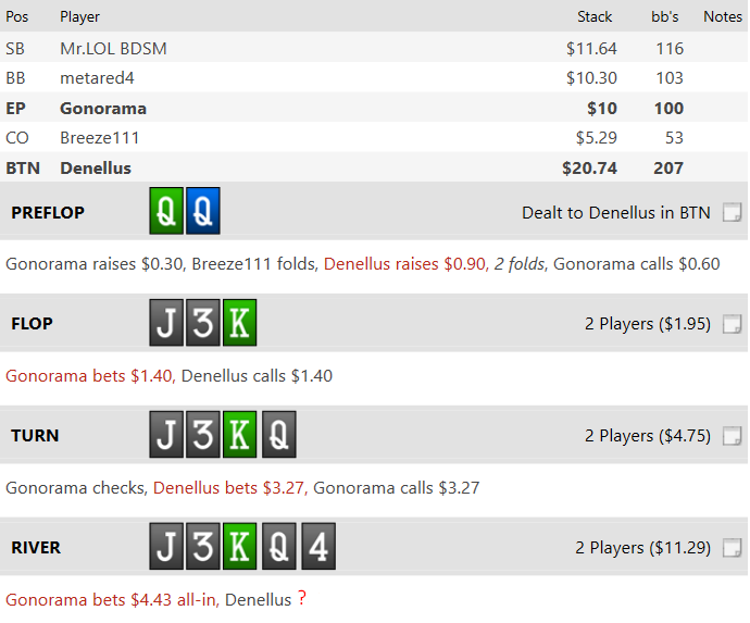 NL10, рег стол. Соперник (Gonorama на MP) - вроде рег, но не плюсовый. 24/19, 3бет 8, Фолд3бет 61, донк флопа 2 из 8 рук. WTSD/W$SD/WWSF 24/50/44. Выборка 52к рук (даже не спрашивайте почему тогда на донк только 8 ситуаций выборки).