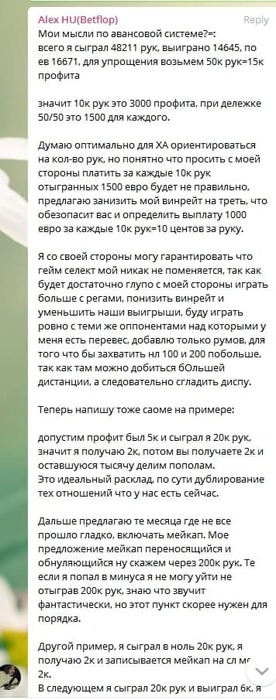 Обе стороны это устроило и мы пришли к соглашению что я отыграю на этих условиях год, особо не прописывая какие либо условия. За январь-февраль я плюсанул еще около 5к, после чего получил вопрос от бекером, как мы можем увеличить наше ЕВ, на что я предложил вариант, по которому я отказываюсь от своих акков по ХА, играю полностью от них, однако за это, не желая доверяться дисперсии полностью я предложил вариант, по которому мне платят 750 евро за 10к сыгранных рук не зависимо от результата. Если профит более суммы выплаты по рукам, то дележка как и раньше 50/50, если профит меньше, то я забираю то что по рукам, и такая же сумма записывается в мейк. На что получил их согласие (скрины есть). Так же мы договорились что мы заключаем данное соглашение на период 250к рук, в случае прекращения договора по инициативе одной из сторон данная сторона облагается штрафом в 10к евро. (так же скрины есть) По сути это весь наш договор. Так же был пункт, что если пакет закончился в минус, то я обязан постараться его отыграть на тех же условиях (с лимитом на попутку в 200к раздач начиная с образования мейка).