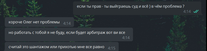 Однако на мой взгляд я не нарушил ниодного пункта из нашего контракта, а если нарушил то прошу ответную сторону предоставить доказательства. Я же в свою очередь готов предоставить скрин нашего договора, но так как он из личной переписки, думаю что пока не имею права ее публиковывать.