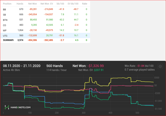 ilyos, график показывает сколько ты выиграл на утг, зеленая-сколько выйграл всего, синяя- выигрыш на вскрытии, красная-выйгрыш без вскрытия, желтая- сколько должен был выйгрпть по EV