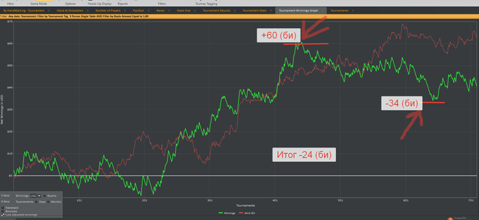 k1lld0nk, поменял стратегию на нитовку . сидел ждал JJ+ AQs+ (на бабле) хотел гонять минимум 60%-40% ну и все равно не тащиться)) как видишь зеленой глубоко похзуй на это. что с красной? я не знаю, я вообще плохо понимаю как она работает. ну ДУМАЮ ЭТО САМАЯ БЕСПОЛЕЗНАЯ ЛИНИЯ . она лишь говорит о "стриках " если тебе складывается. она в плюси или в ноле. если нет то она в жопе соответственно. хотя я могу ошибаться конечно)))