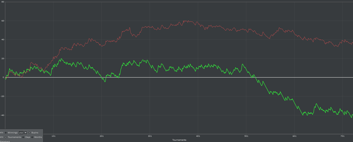 делаешь все правильно (пуш, постфлоп) и тебе выкатывают на воротник. играешь как говно тебе плюшки насыпают . ну что за х.... Ня!!!!!!!!!!!!!!!!!!!!! вот график по фишкам. поменял страту,на 15к рук , думаю может я бабл криво играю, на до бы окуратней . Да ху.. там!!! просто синяя начала идти вверх, а красная в ад. результат один и тот же. вообще считаю уже, что любые выставления это 50/50. хотя по факту так и есть! вряд ли у кого то пуш фолд больше 53%.