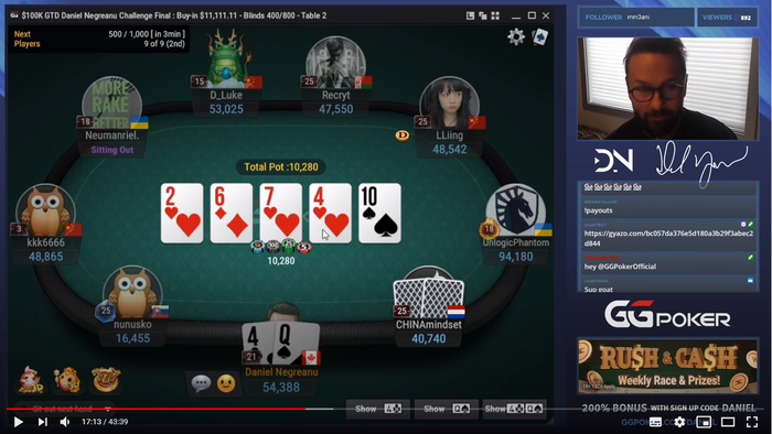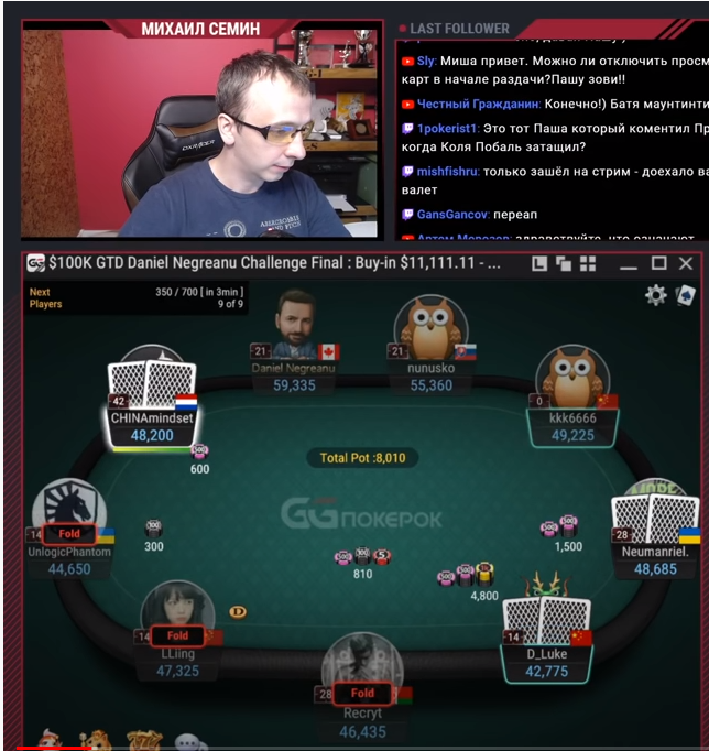 Здравствуйте. В последнее время, на Джипси много похожих тем, поэтому не думаю, что это случайность. В прошлом году, я отобрался на финальный стол $100,000 Guaranteed Daniel Negreanu Challenge. https://www.promo.ggnetwork-contents.com/daniel-negreanu-100k-challenge?lang=ru Перед турниром, я поставил такой аватар: С первой минуты турнира, начали происходить аномальные лаги, фризы, подвисания. Первое аномальное подвисание получилось здесь, после которого, я ушел в ситаут. https://youtu.be/cPxZgvw2im4?t=260