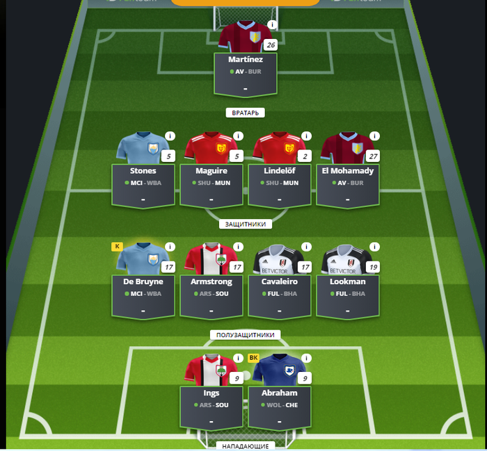 Инфы очень много полезной по фентези спорту , времени зря не терял, разбирался и анализировал, в итоге вот такой состав выкатываю на тур. Тут сразу стал мыслить по другому, да и тем более все матчи прошлого тура АПЛ я благодаря отпуску и okko sport посмотрел от свистка до свистка) 1) Астон Вилла - команда очень понравилась, понравился Мартинес (кстати хотел взять Ареолу из Фулхема, но передумал) который тащил всё и вся в матче с "волками" Играют они с Бёрнли, который забивает не так уж и много. В прошлом туре им вообще Обамеянг в этом помог! 2) МЮ и МС - считаю что Юнайтед в состоянии сыграть на ноль с аутсайдером лиги, Стоунса взял так же по этой же причине. Де Брюйне делаю капитаном считаю что он обязательно будет в старте, так как много отдыхал в последних матчах ЛЧ, да и вообще атакующий потенциал у Сити просто космос) 3) Фулхэм - удивлен и поражён тем как они возили Ливерпуль)...опять же Лукмана и Кавальеру ставлю одними из первых,очень понравились в прошлой игре! Да и Брайтон пропускает в гостях прилично! 4) Саутгемптон - команда в состоянии бороться даже за медали АПЛ, также удивлён их игрой. Такой Арсенал каким я его видел в прошлой игре они даже не почувствуют я думаю! Ингс в нападении играл отлично, много бил, жаль реализация немного подвела.