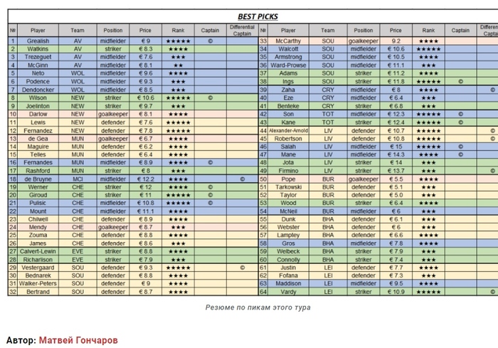 Увидел тут пост о стриме Леброньки (конкурс состава не застал), начал смотреть запись. Там увидел картинку с сайта Sharp Fantasy, где были прогнозы на победы, клиншиты (заодно узнал, что это такое ), голы. Зашел, начал изучать обзор ближайшего тура, до которого оставалось часика три. В целом формат их понравился как для новичка, разве что оформлено сравнительно неудобно (листать далеко туда-сюда и нет четкого форматирования). Зато удобно, что в конце сразу есть табличка с рекомендуемыми игроками и оценками. Можно сразу собирать рабочие стеки и хотя понятно, что мнение автора сугубо субъективно (впрочем, как и любой аналитический материал) и, возможно, надо делать скидку на бесплатность обзора (вероятность умолчания о каких-то +EV действиях), — фишу вроде меня это позволяет очень быстро накидать несколько вполне конкурентоспособных на первый взгляд составов, не потратив при этом практически никакого времени на подготовку.
