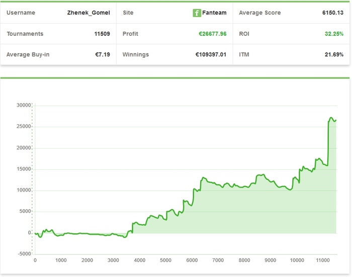 Кстати, для рекреационных игроков, который как и меня пугает необходимость бороться с монстрами, выставляющими по 200 составов, есть хорошая новость — шансы занять топ-место таки сохраняются. Например, в прошедшем турнире было 6 участников в топ-20, выставивших всего от 1 до 3 команд (2, 11, 14, 15, 18, 20 место). Вероятность похоже что пока что все таки чуть повыше, чем в аналогичной килополяне в покере, хотя понятно, что в целом эти шансы поймать любителю синюю птицу примерно из той же категории, что в MTT.