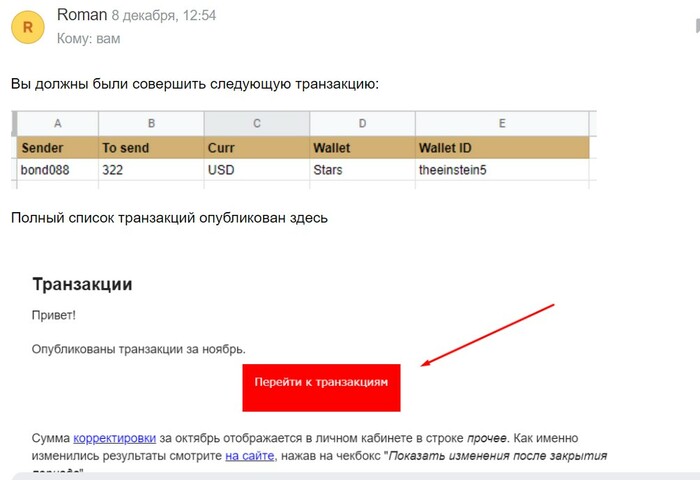 Получив письмо, игрок должен нажать большую красную кнопку "Перейти к транзакциям", после чего откроется гугл-док со списком транзакций. Там конкретно расписано, кто, что и куда должен послать. В самом письме так же указываются разные факторы, повлиявшие на результаты пула. Скам - один из таких факторов, поэтому его указывают в письме.