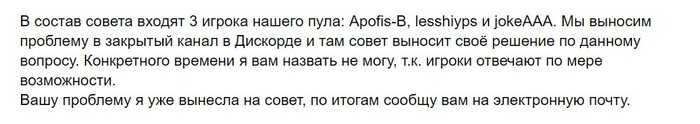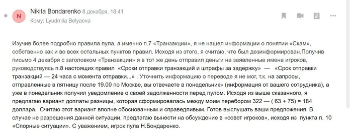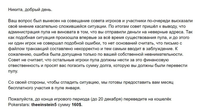 Впервые вступив в ноябре в пул, я сыграл по итогам месяца с перебором и должен был перебор отправить на указанный счет usd. Расчеты с пулом должны были проводиться путем перевода денег непосредственно в самом руме путем перевода игроку. После окончания отчетного периода пришло письмо следующего содержания