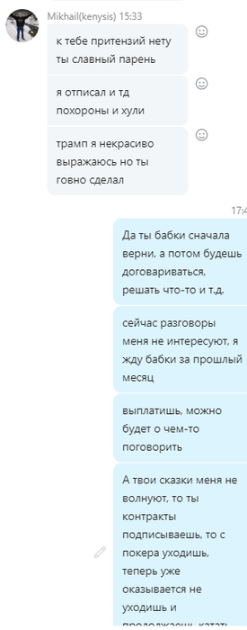 На просьбу, для начала рассчитаться за то что уже сыграно ответил следующее.
