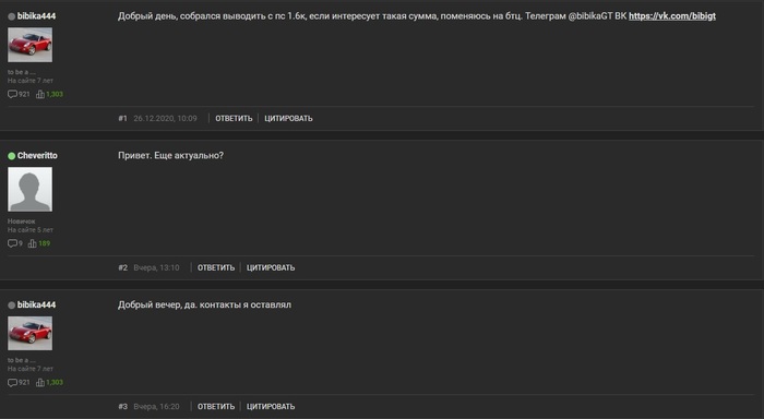 История короткая и простая. Договорились с игроком об обмене (мои BTC на ПС от bibika444) двумя частями по 500$ каждая. После моего перевода первых 500$на предоставленный кошелек человек пропал. Предоставленный профиль в ВК более не существует, а в телеграм сообщения не доходят. При необходимости могу предоставить скрины переписки.
