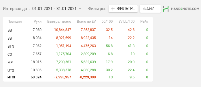 Я играю в покер 9 лет, в основном играл в оффлайне - катраны, в онлайне с 2014 года во всех румах шел в -, но 14.12.2020 я решил что пора заканчивать с этим и взялся за голову, очень был мотивирован Андреем Козленко и его видосами, начал играть по бр, чартам, использовать х2н, чего раньше никогда в жизни не делал, результаты на лицо!