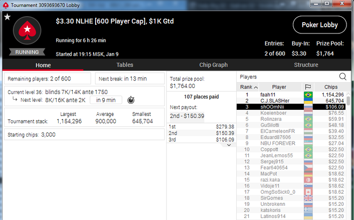 Немного турниров сыграл и снова в минус, вчера вообще был дикий тильт, старзы глючили и постоянно пропадало соединение, так же вывел все деньги с пати и закинул на ГГпокерок, открыл лобби а там почти нет турниров за 1-3$, ближайший турик за 2$ был через 5.5 часов хз че делать, завтра посмотрим, может из-за вск было мало микролимитных