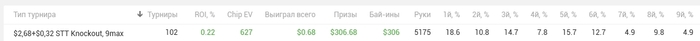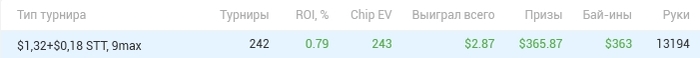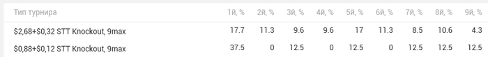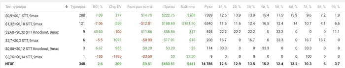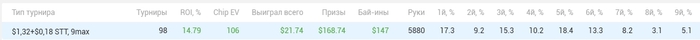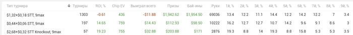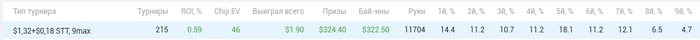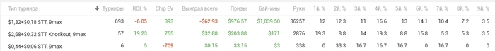 Почувствовал уверенность в своих силах, решил перейти на турниры по 1,50. Пока идет неплохо, но дистанции еще никакой нет. Катаю по 6 столов, больше пока некомфортно, поэтому набирается долго. Через пару дней скину отчет, когда будет хотя бы пара сотен турниров.