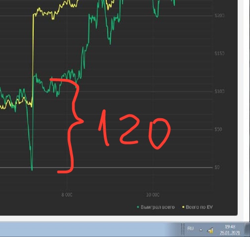 Всем привет. Меня зовут Максим. Играю в 6+ на постоянной основе больше года. Раньше катал на старзах: начинал свой путь с анте 0.02$, потом 0.05$ и 0.1$. После полу года игры начал гриндить анте 0.5$. Всегда выводил прибыль, оставляя на игру 20 бай-инов. За что меня и наказала диспа на анте 1$ (НЛ 100). Сейчас перешёл на GG. Заново набиваю свой банкролл и поднимаюсь с микролимитов. Пока откатал около 25 к рук (график прикреплю ниже) на анте 0.02, 0.05 и 0.1. Последующие результаты так же буду публиковать. Хочу поднять и обсудить несколько вопросов, которые меня волнуют по игре. Буду рад услышать критику, либо пояснения. И так, первый: все мы знаем, что Pokercraft не учитывает EV с 3+-way all-in, но я заметил, что деньги, выигранные с них идут в зачёт зелёной линии (Net won). Получается, если ты ПЛЮСОВО выставляешься в тройных олл-инах, то на графике зелёная линия будет выглядеть как переап. Если я что-то не учёл, отпишите ниже. Второй момент: все мы знаем, что на GG действует Flash jackpot. И выставляясь с флеш дро линия EV будет тоже отображаться некорректно. К примеру: на анте 0.1 я закупаюсь на 5$. Попадая во флеш-дро, и принимая all-in я имею 37%. Но претендую я на банк не 10$, рискуя 5-ю$, а на банк 16$ (jack-pot на этом лимите в среднем 5.5-7$) Вот и считайте сами.