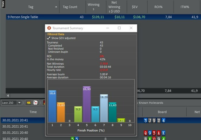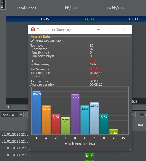 Привет меня зовут Ден, играю на PokerStars 9max KO 3$ и 5$. Пока результат выглядит как-то так (это с декабря 2020). Цель накопить 1k для игры на 10 лимите (сейчас БР 270).
