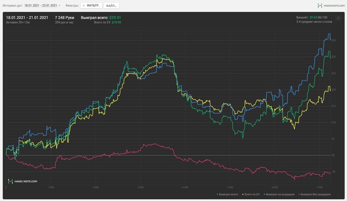 1. Стартуем с NL2 с бэром 20$. Задача набить 100$ 25.01.2021 баланс 102$, винрейт по лимиту 28бб/100