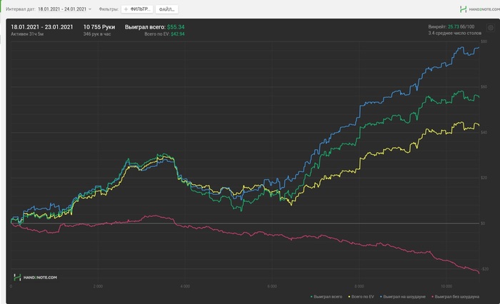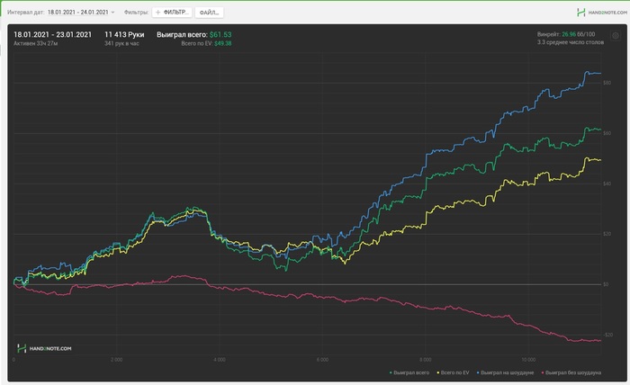 2. После достижения пункта №1 переходим на NL5 и набиваем до 250$ 01.02.2021 , баланс 251$, винрейт по лимиту 21бб/100