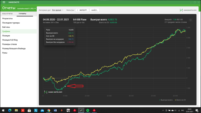 Добрый день, наиграл 15000 рук 0.25 на 45 человек, pokerstars. Банк изначально 25$, попросту не могу подняться выше, как будто блин магия какая - то, серьёзно. Я не понимаю вообще в чём проблема, допустим сливаю до 20$ и через пару сессий поднимаю обратно, могу выйти немного за 25$ но по итогу опять спускаю до 20$ и поднимаю до 25$. Пару дней назад слил до 16 долларов банк и сразу же начал поднимать, выиграл за пару сессий 28$. Сейчас опять пошло в минус, просто не везёт JJ в AA, в QQ ну и сам ошибки допускаю понятное дело. В чём может быть проблема, может кто подкинет хотя бы какие - то идеи для размышлений, а то у меня уже апатия какая - то. То что я не проигрываю постоянно как бы говорит о том что я не плохо играю, но тем не менее я не могу выйти за 25$ и всё. График на sharkskope выглядит как бесконечная лесенка, вверх вниз, вверх вниз.