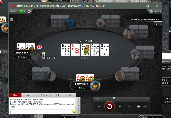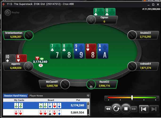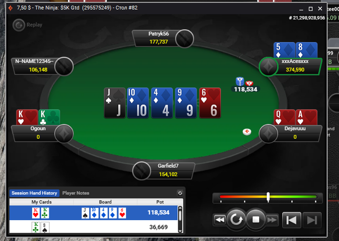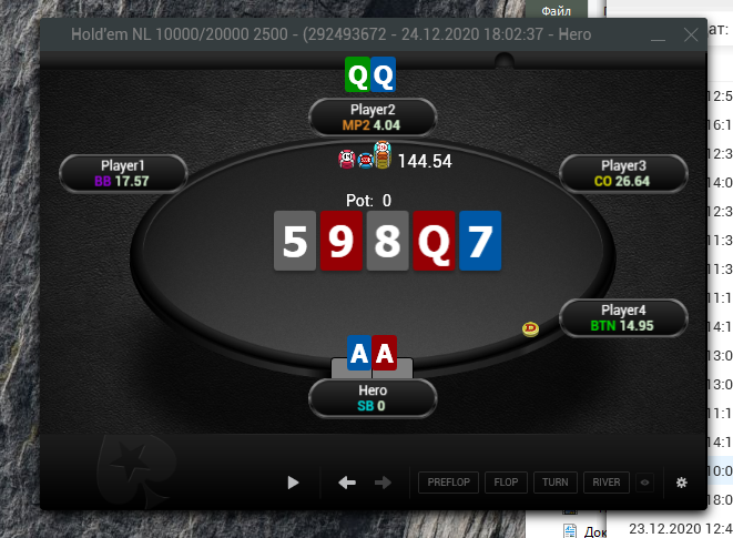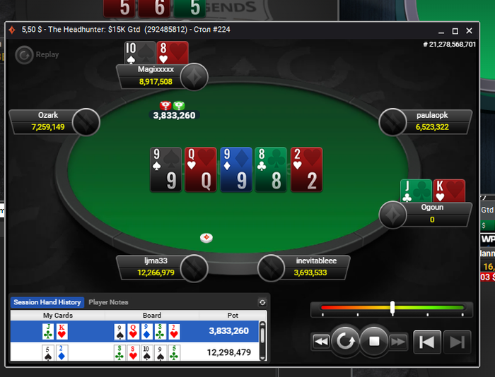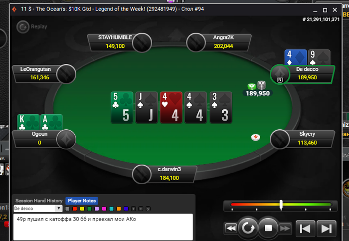 На пати был баланс около 2000 зелени и в течение 2, 5 месяцев он стремительно стремился к 0, и вот пару дней назад очередной раз смотрю в реплеере раздачи и анализирую игру и думаю, ну опуститься до 0 и перестану на пати играть и буду депозит на покерке рассматривать, и пару дней назад оставалось буквально 10 баксов и случился небольшой занос на 300 долларов. На самом деле, 0 на балансе меня тоже бы обрадовал ибо клиент адски лагает, поле конечно на пати в турнирах слабее процентов на 20 о чем говорят винрейты, но божечки как же лагают финальные столы. Так что приходиться играть сейчас в этом руме, и там начало очень не плохо даже складываться, чего не скажешь о старзах. Вчерашняя сессия по ев на старзах, пати не стал трекать, ибо евеха вчера зашкаливала, не хочу печалиться там цифры большие) По краю лезвия вчера ходил, только ривер спасал, префлоп поехали Этот же турнир, все очень тайтово сидели, предфинальная стадия, плохо раздавали, около 9 бб стек был, запушил без вариантов и товарисч на 108р долго думал и отколол, нок был хороший. Дипран в хоттере улетел, все все правильно сделали, игра такой) В магнифе вот так поехали префлоп